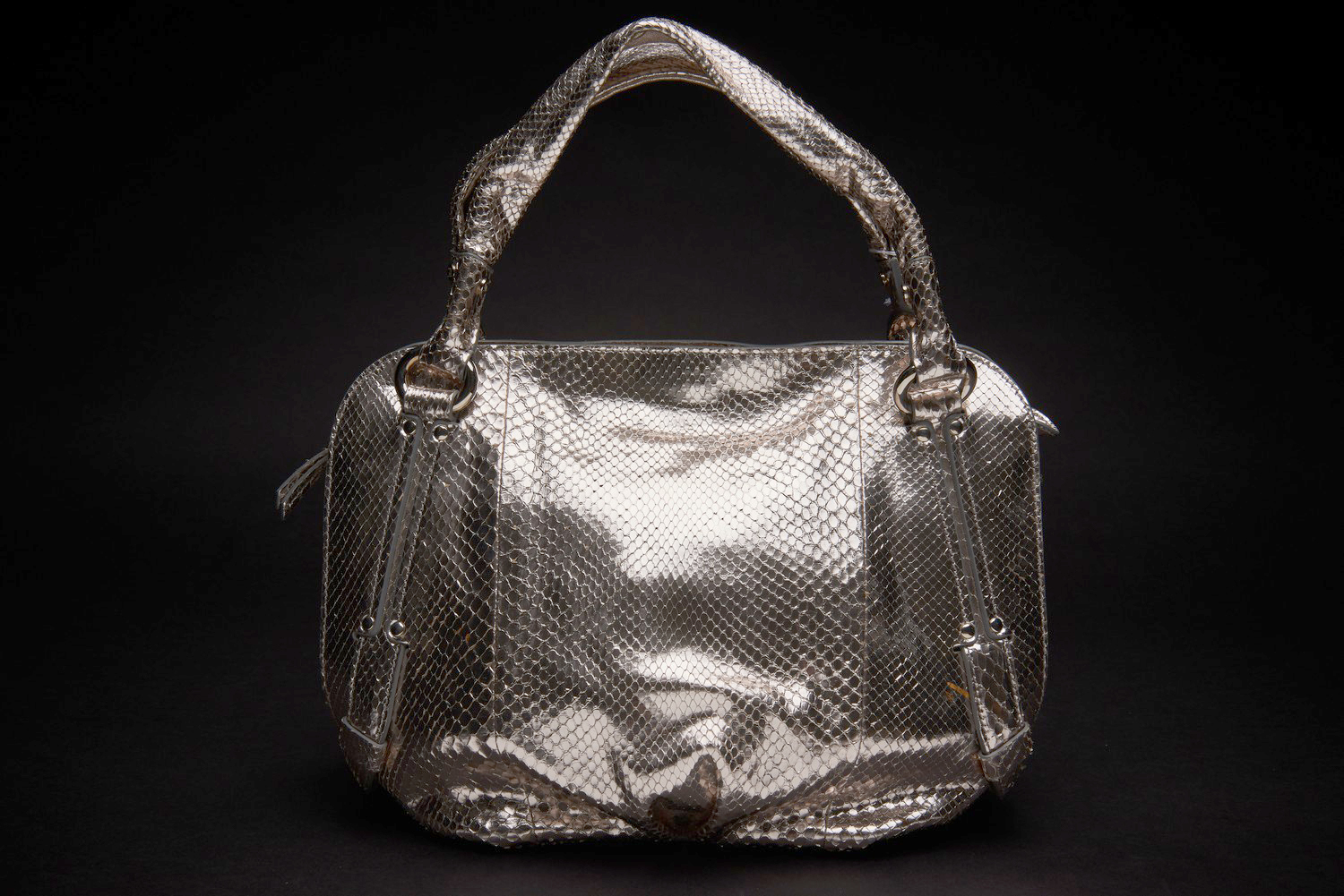 Styled in silver python leather with silver metal hardware, 25 x 36 x 12cm.