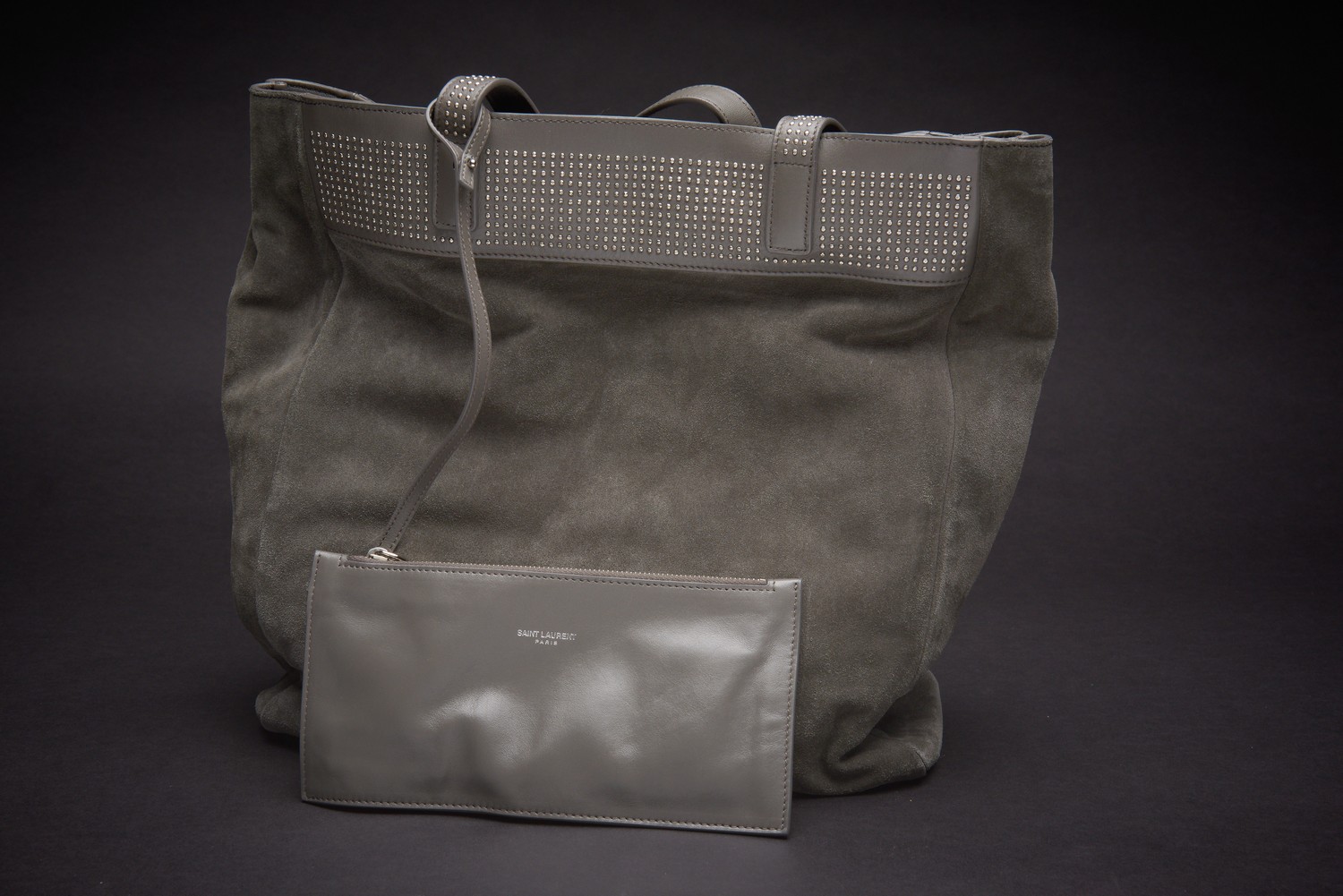 Reversible design in grey suede and calfskin with stud detail and interior purse, 33 x 31 x 11cm.