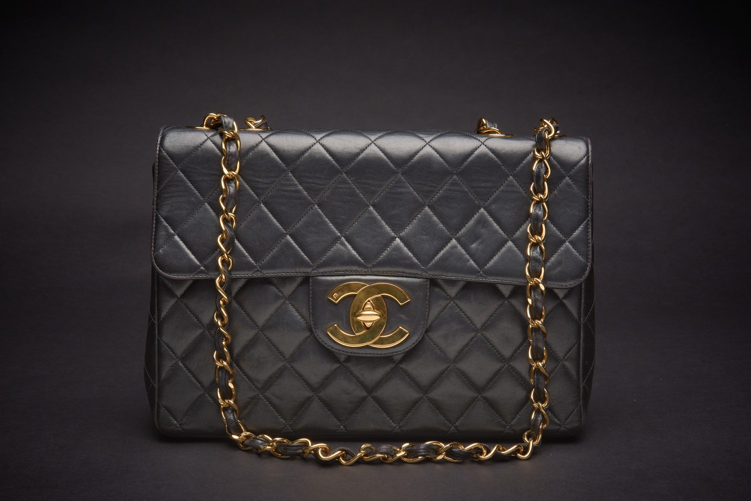 Styled in black calfskin leather with gold metal hardware and chain weave strap, 20 x 30 x 10cm.