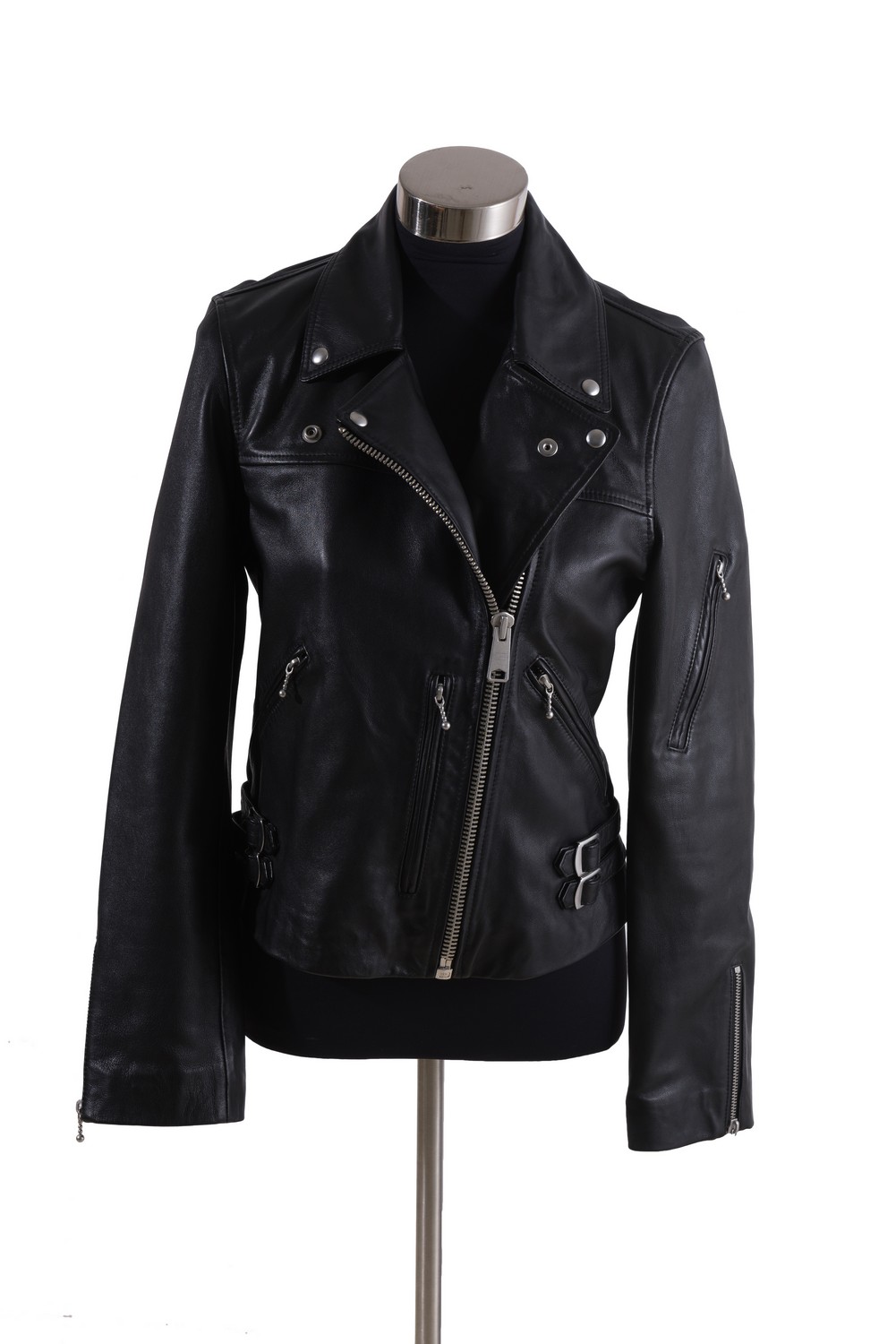 Styled in black leather with silver metal hardware, labelled size UK12.