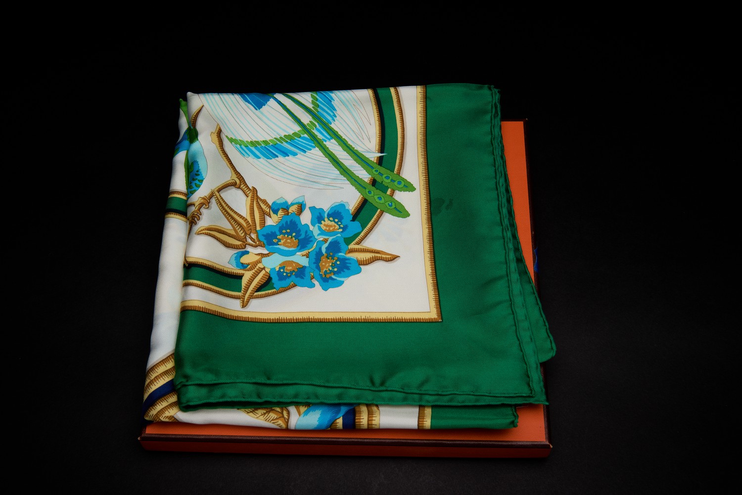 The 'Caraibes' design by Christine Vauzelles on green and white background, 90cm square, boxed.