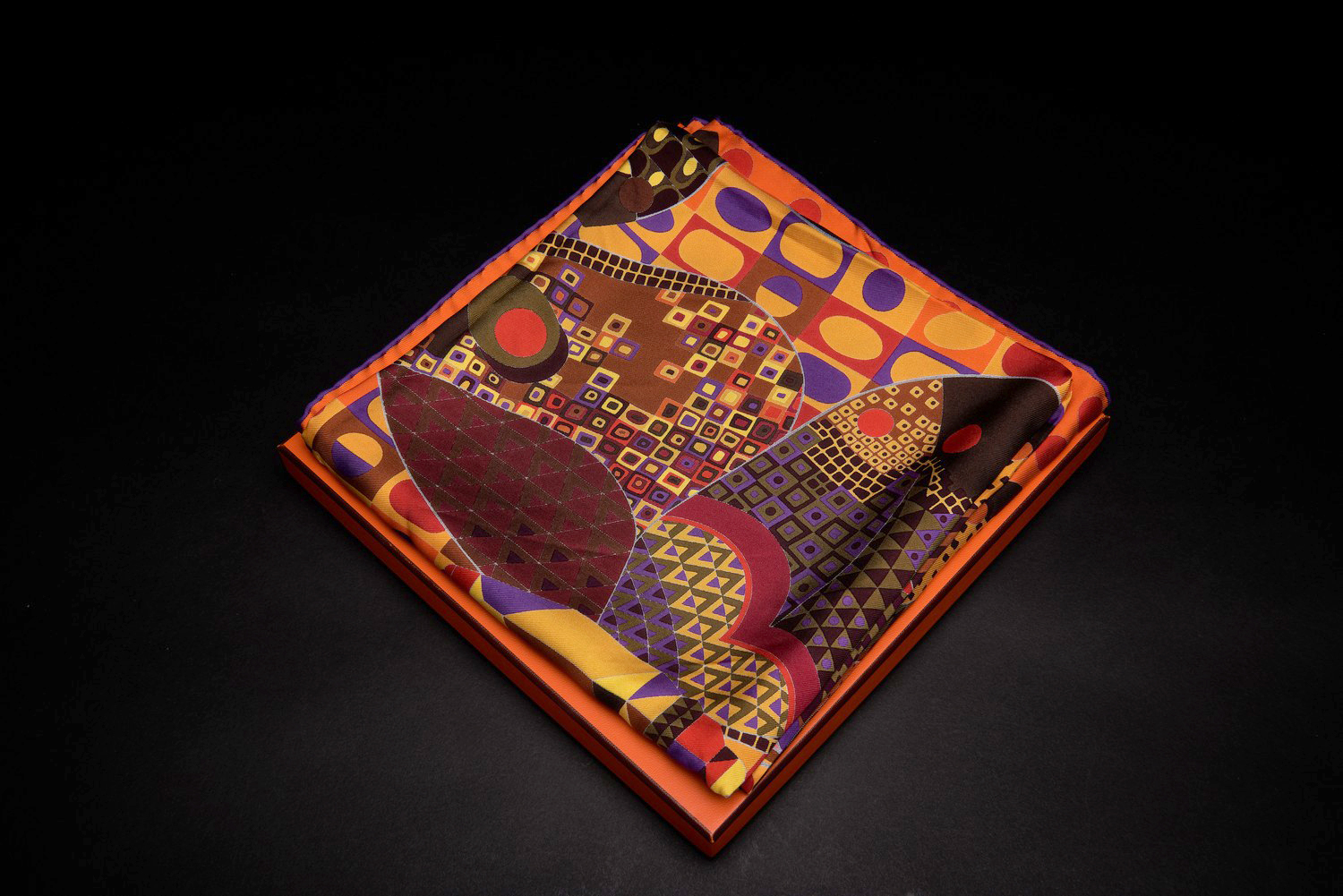 The 'Les ailes de la soie' design by Aline Honore on orange background, 90cm square, boxed.