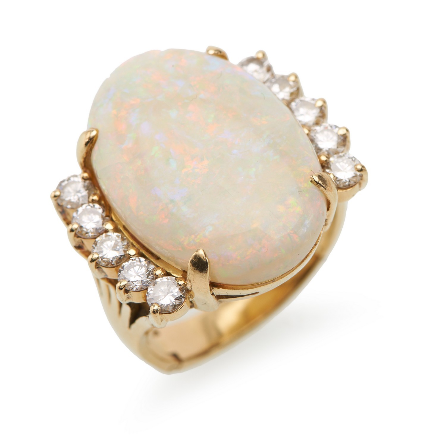The ring presents in very good condition overall with all stones secure in their settings. The opal has very minor crazing. Diamonds are secure in their settings and are of a very good commercial colour and clarity.