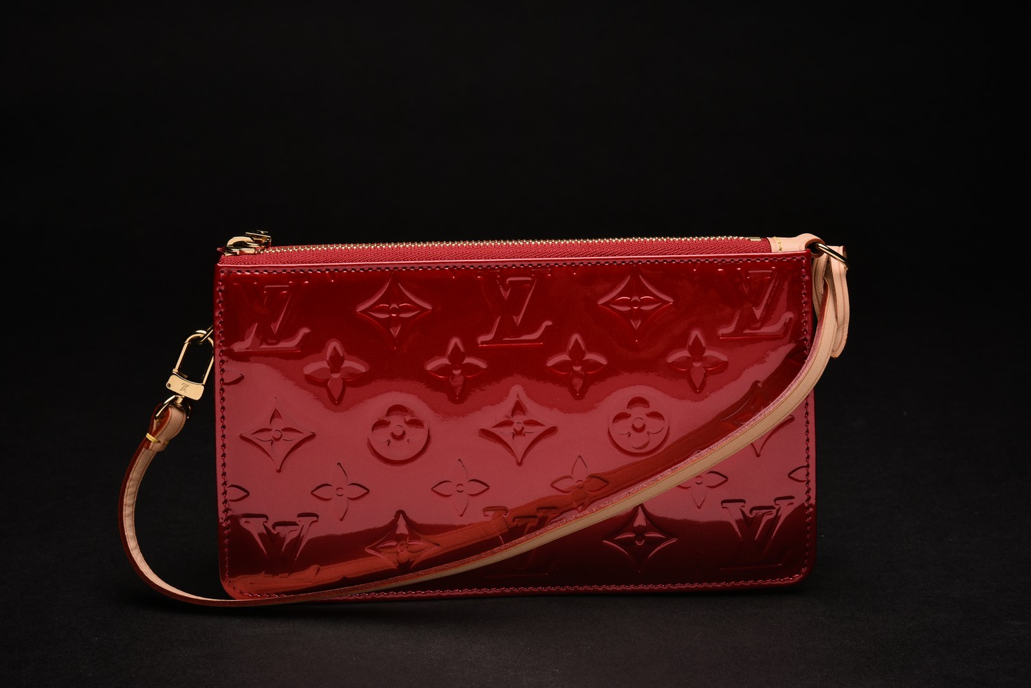 Styled in red Vernis leather with tan leather handle and gold metal hardware, 12 x 20 x 3cm.