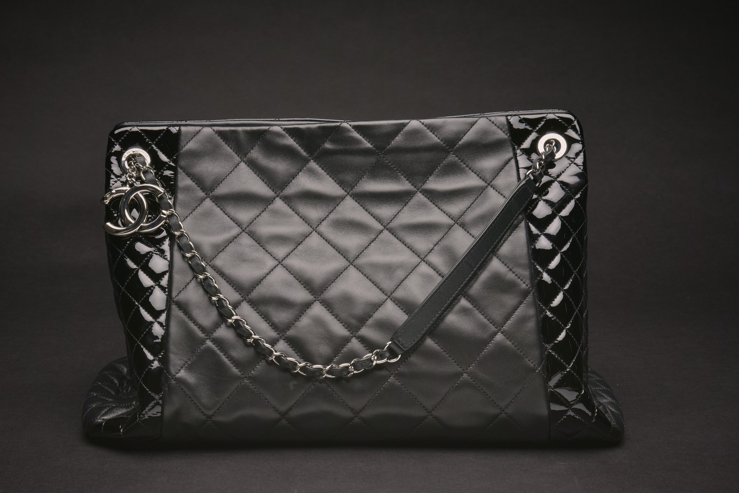 Styled in black calfskin and patent leather with silver metal hardware, 26 x 40 x 15cm.