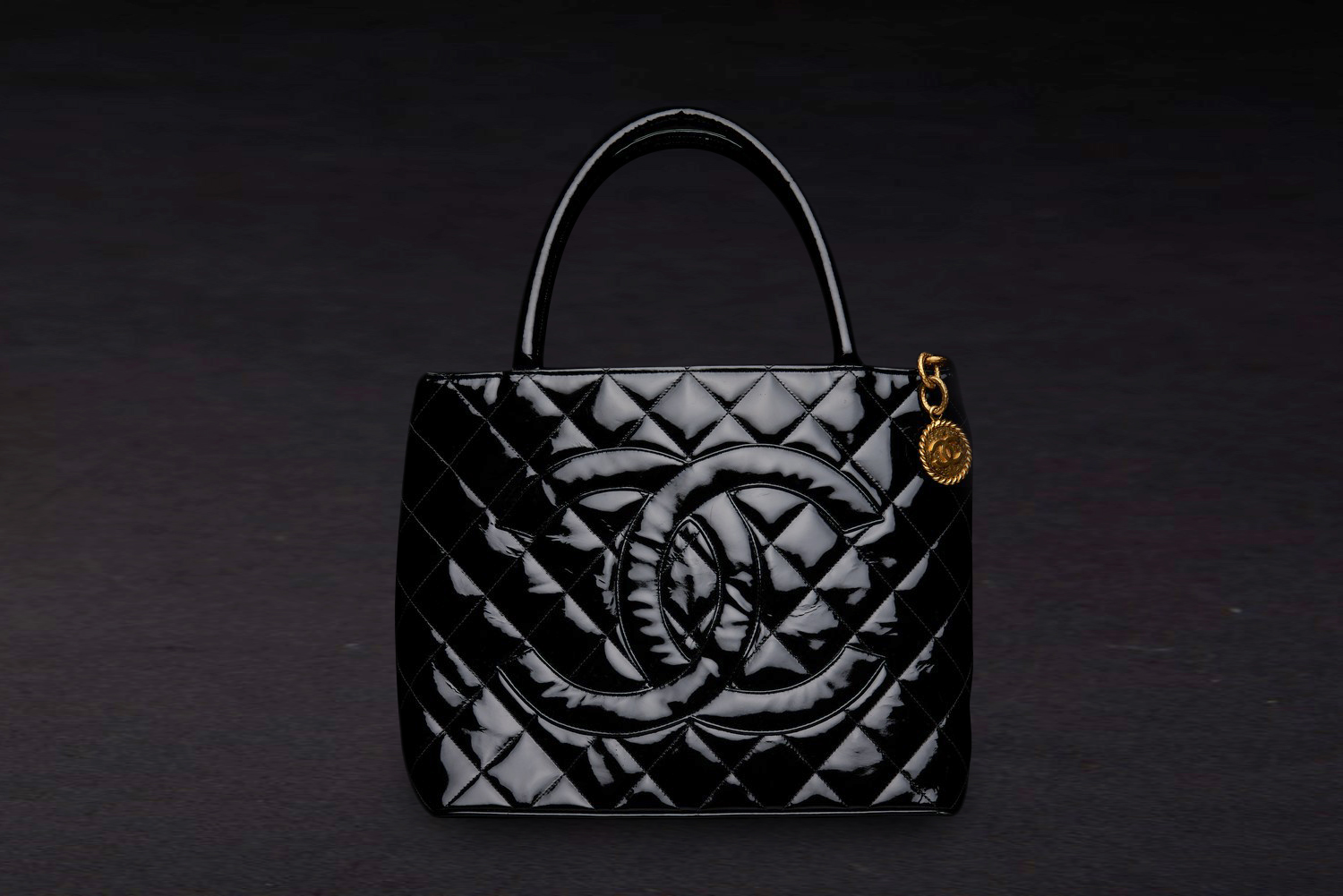 Styled in black patent leather with gold metal hardware, 25 x 30 x 14cm.