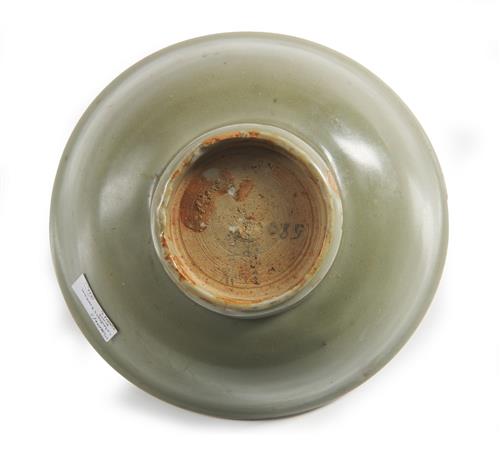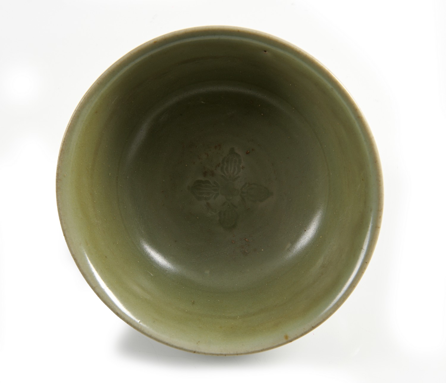 Decorated to the interior center with an impressed visvajra motif. The interior of the base unglazed.