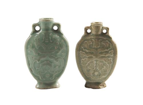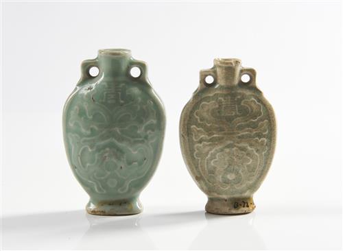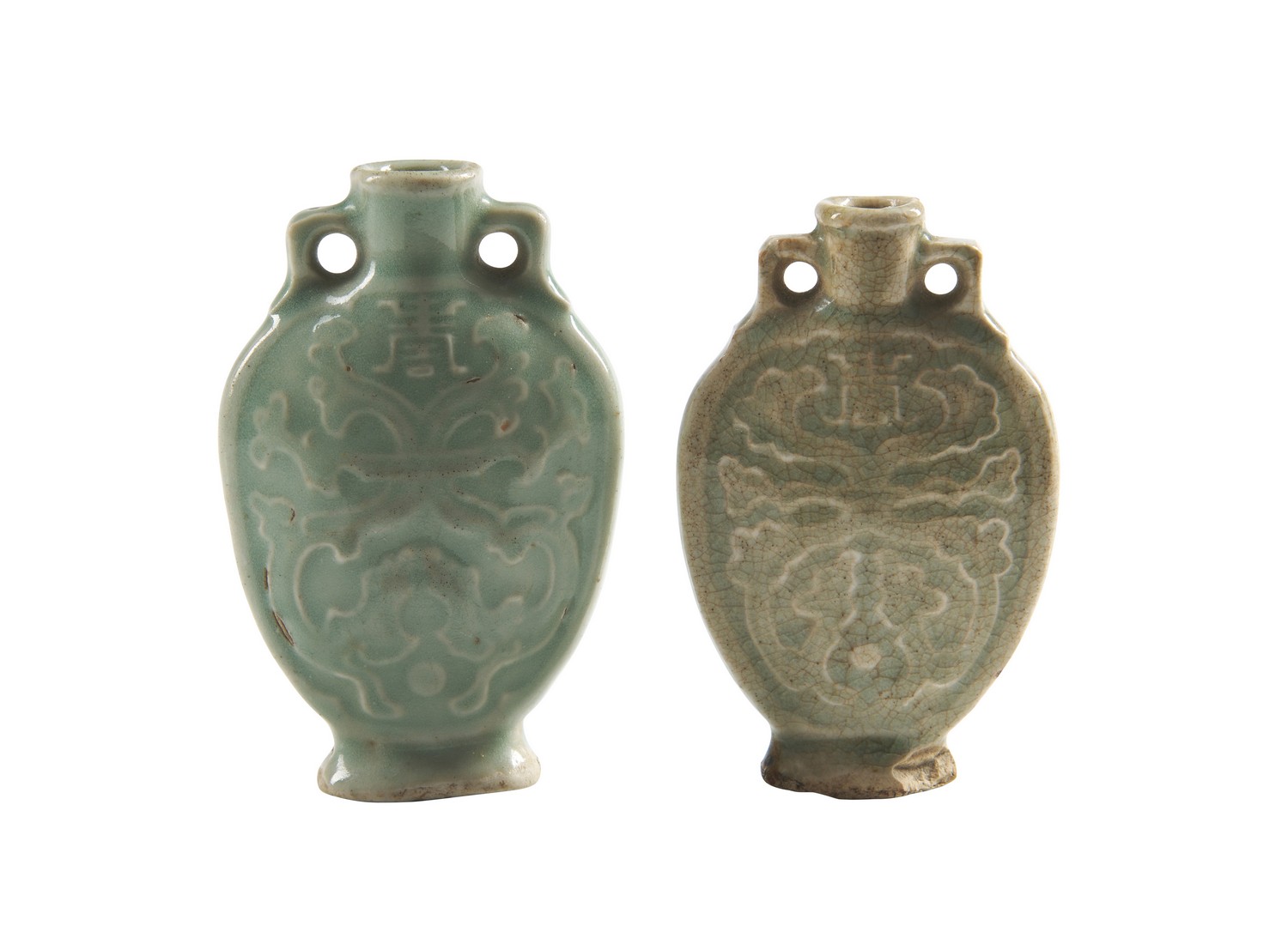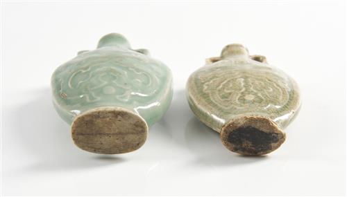 The larger snuff bottle with no visible faults or damage. The smaller snuff with a chip to the mouth rim and a chip to the foot rim. Approximately 180 gms total weight for the two.