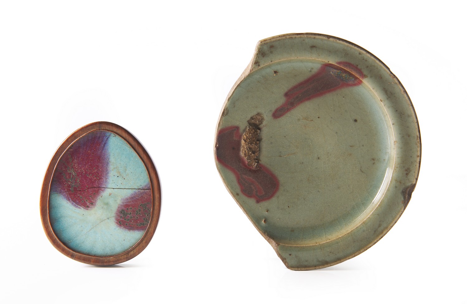 One fragment with a grey-green glaze, the other with a bright sky blue glaze mounted in a hardwood frame, both splashed with copper red.