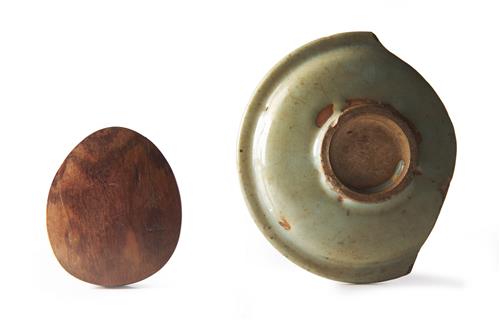 both fragmentary. The larger fragment with chips to the rim and the broken section ground on the edges. The framed fragment broken through the centre. Approximately 540 gms total weight for two together