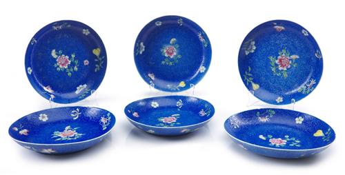 one small chip to the rims of each of three plates. one other plate with multiple very small chips to the rim. two plates with no visible faults or damage. Approximately 3085 gms total weight for six dishes.