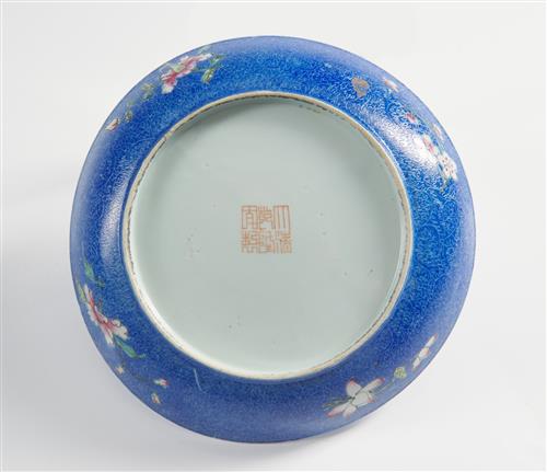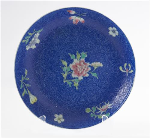 Decorated with famille rose flowers against a blue enamel sgraffito ground, with Qianlong marks in iron red to the base.