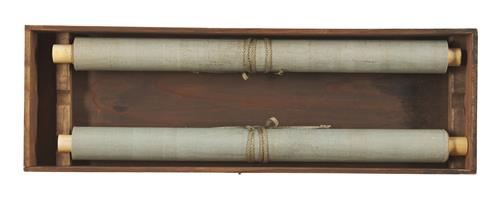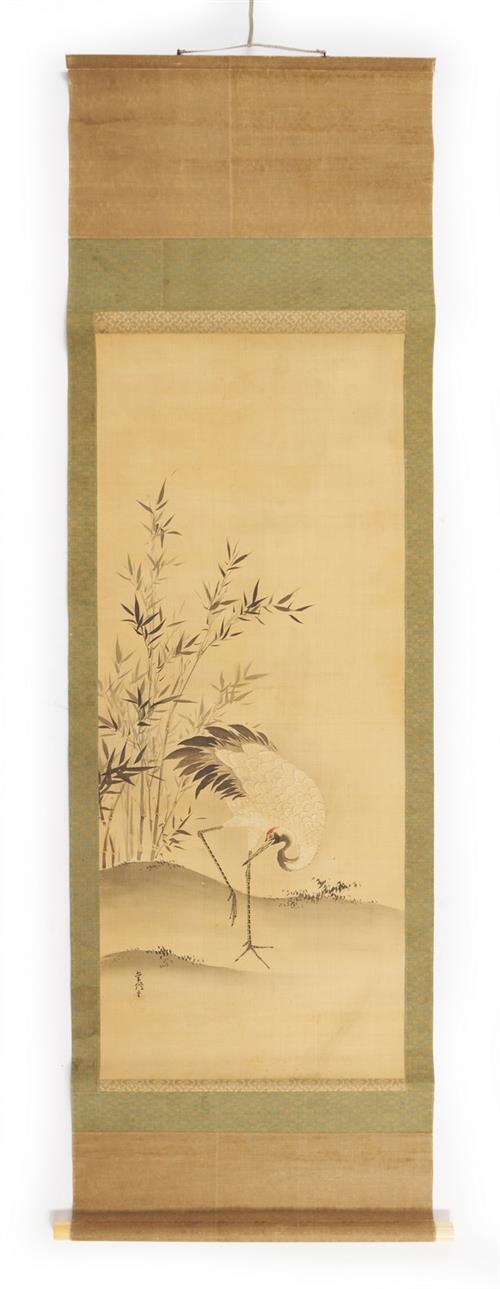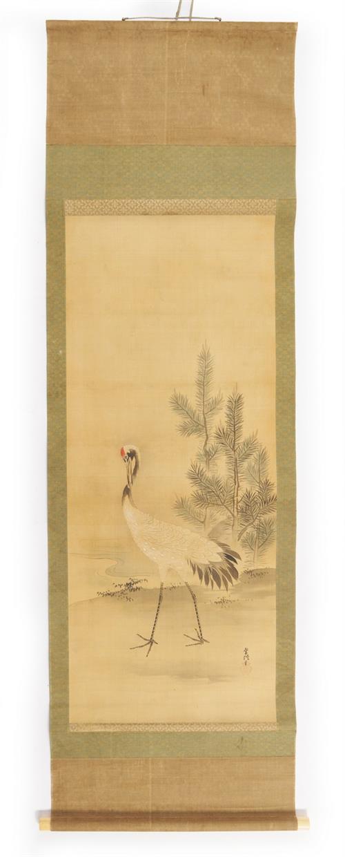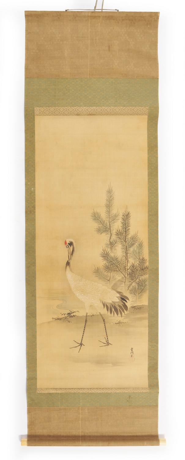 Decorated with Manchurian cranes with bamboo and pine trees, mounted as scrolls, together with an inscribed tomobako (original wooden box) for three scrolls (one missing).