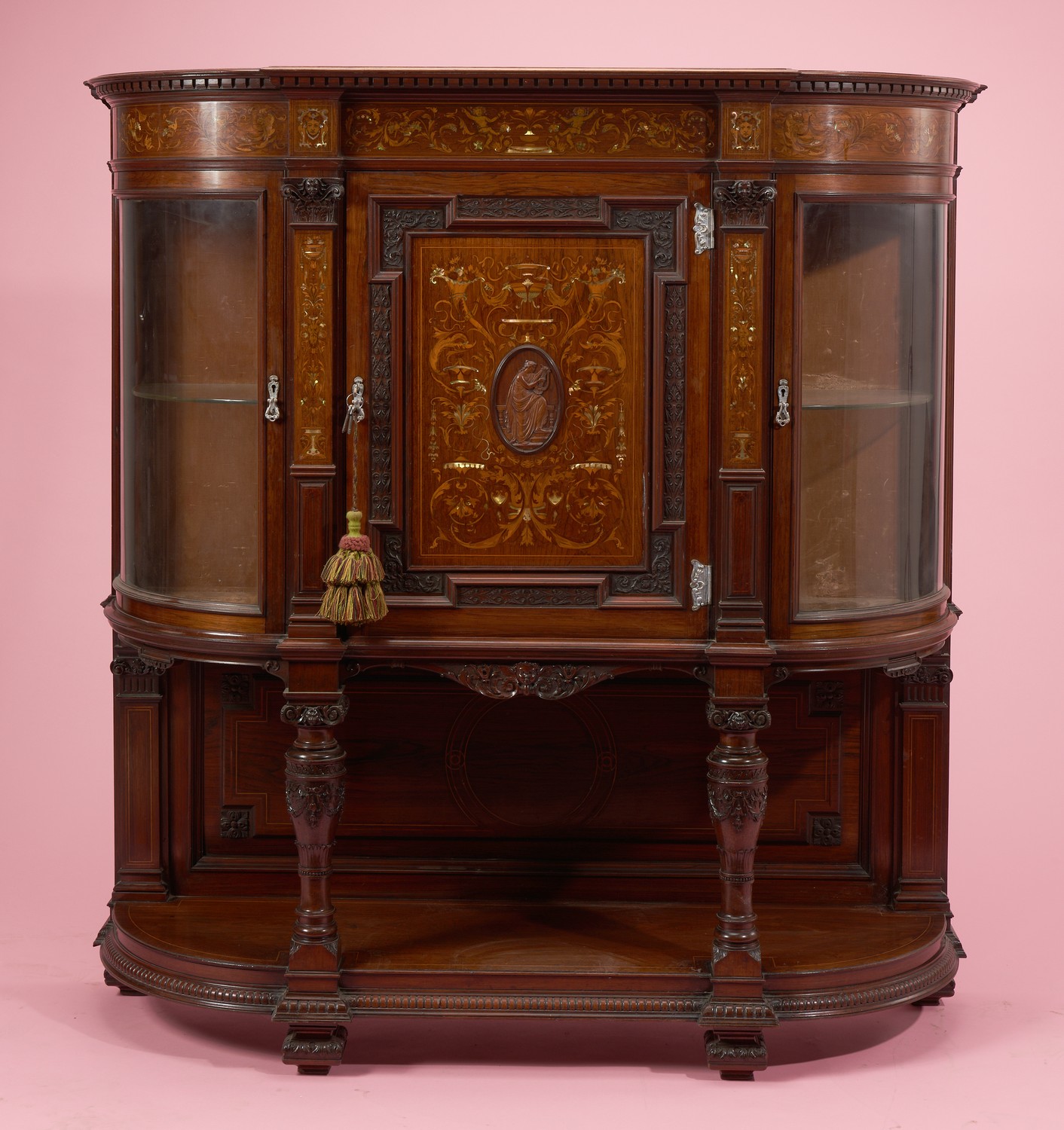The moulded cornice above curved glazed sides, with marquetry columns inlaid with mother-of-pearl, carved inset panels, all flanking a central marquetry door with a central plaque depicting a woman with lyre, above a lower recessed shelf with turned supports. Stamped 'GILLOWS 16649' inside the central cupboard door