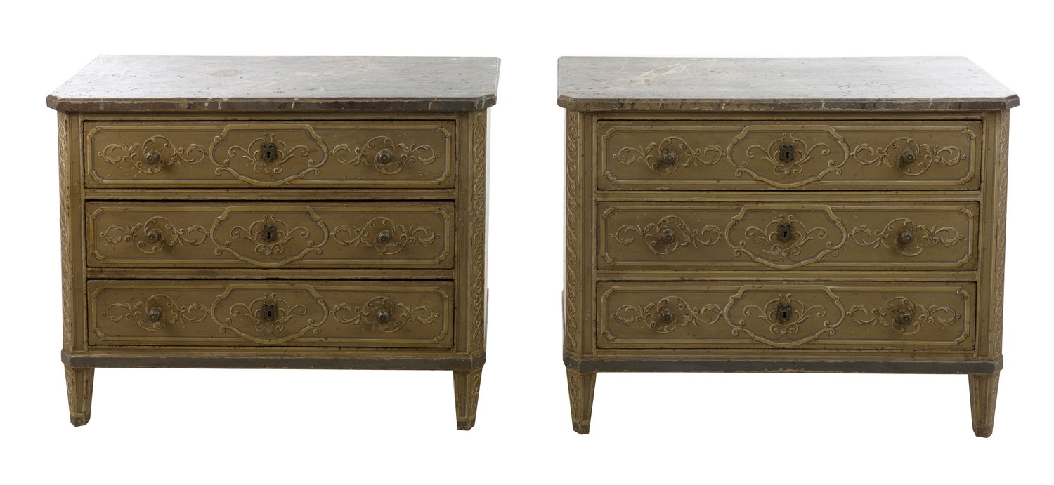 Each painted with a faux marble top and foliate motifs to the front and sides, the front champhered corners terminating on tapered feet, the three drawers applied with key hole escutcheons and patinated brass knobs