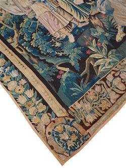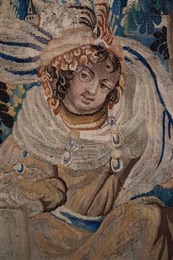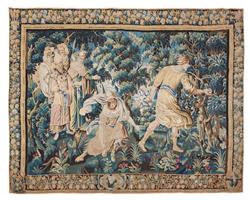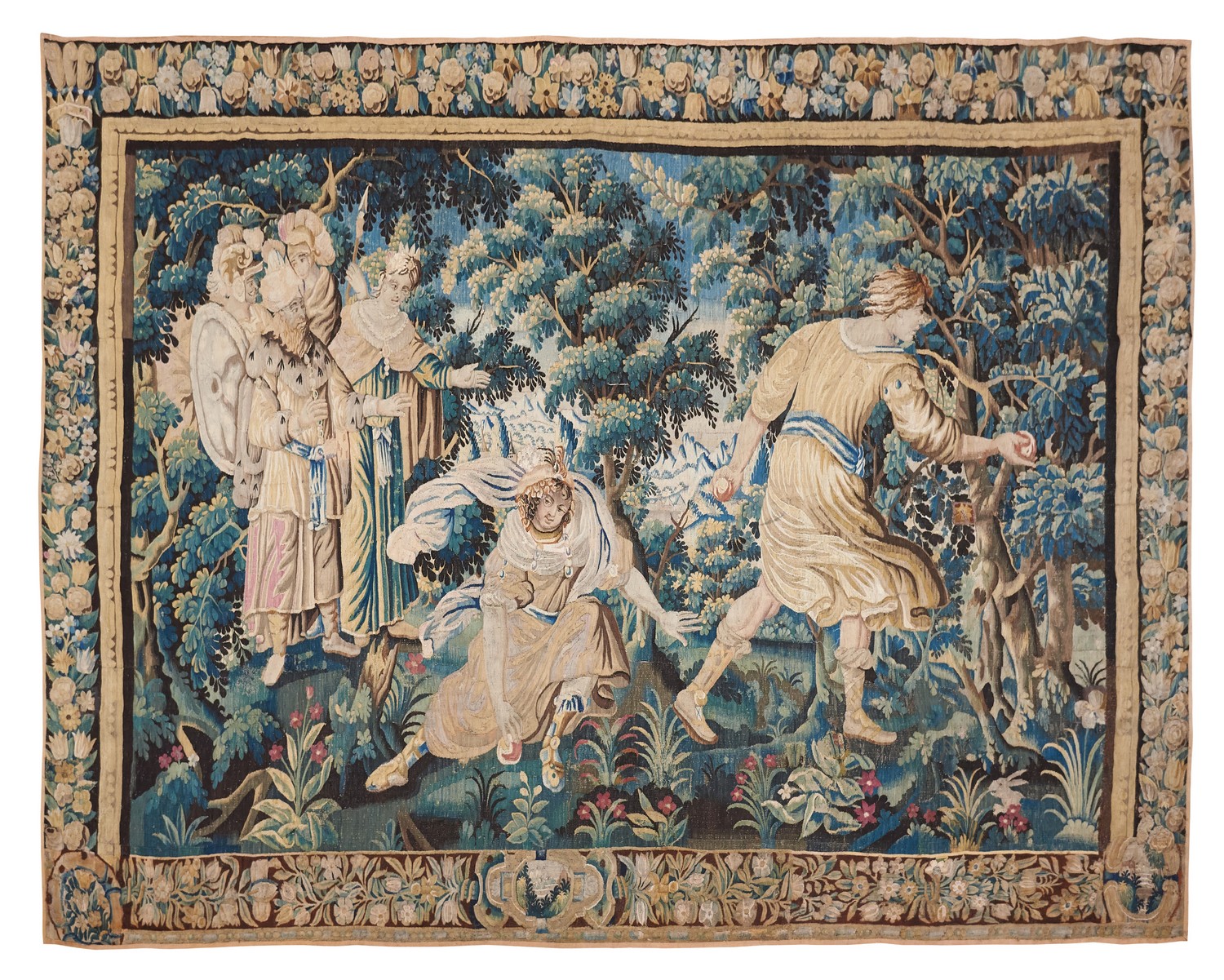 Depicting an allegory of 'The Judgment of Paris'. Woven in wool, depicting an open wooded landscape with six figures in the foreground and a mountainous landscape in the background