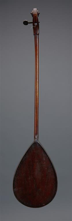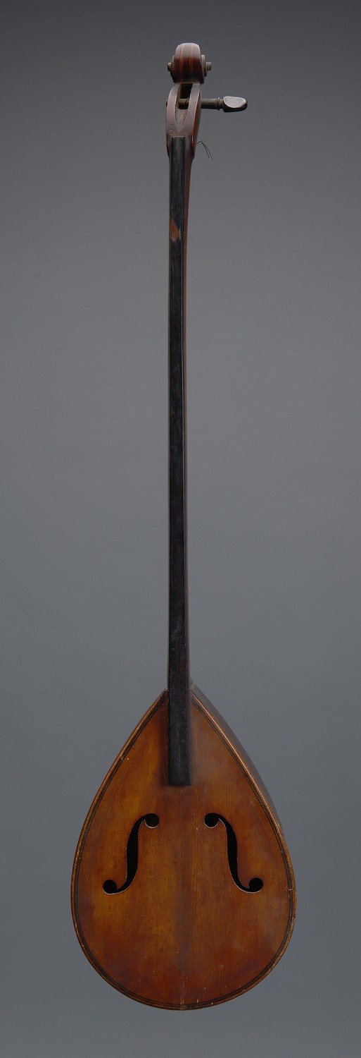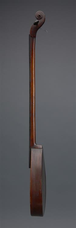 The elongated fingerboard joining to a rounded flat back lower body. The back, ribs, neck & scroll modelled from a single piece of maple