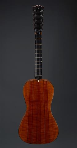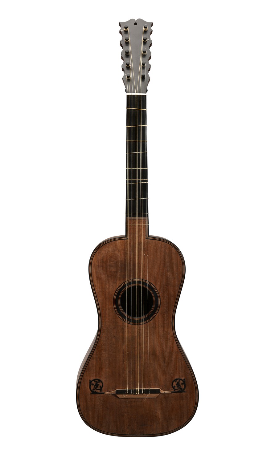 Ten strings, 'AUBERT A TROYES' marked to the interior and verso of the body, rings of ebony inlay to the sound hole and edges of the body, the bridge terminating in delicately cut scrolling vines