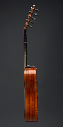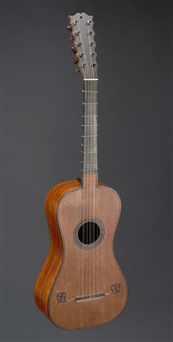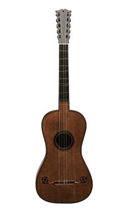 Requires servicing. Unplayable condition consistent with age and use. Cat gut frets, missing strings. Partially repaired. several cracks to soundboard. Crack to headstock. Delamination to trim.