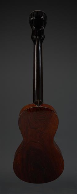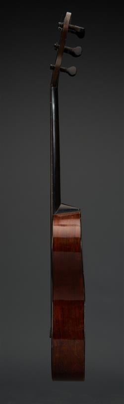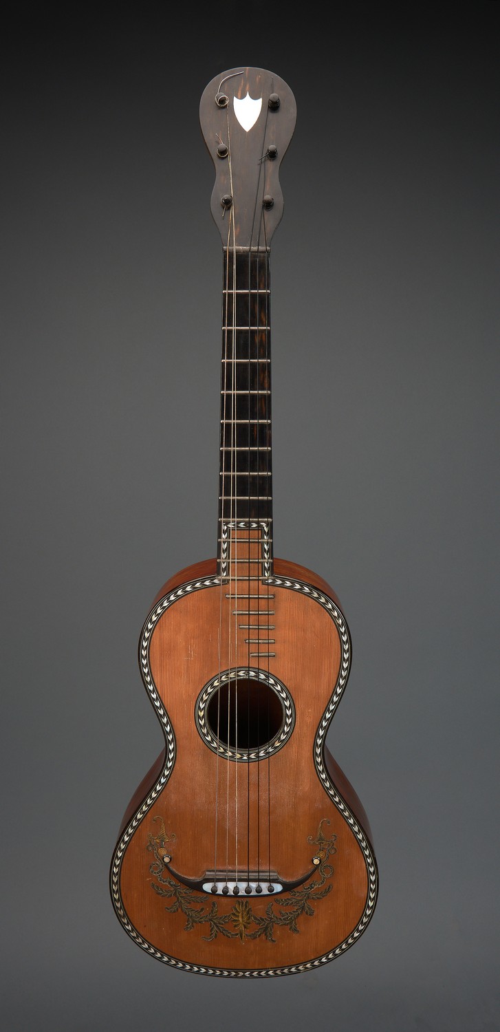 Mother-of-pearl herringbone inlay to edges and around sound hole. With polychrome design surrounding the bridge comprising two dolphins and garland designs, maker's mark to interior. Original case.