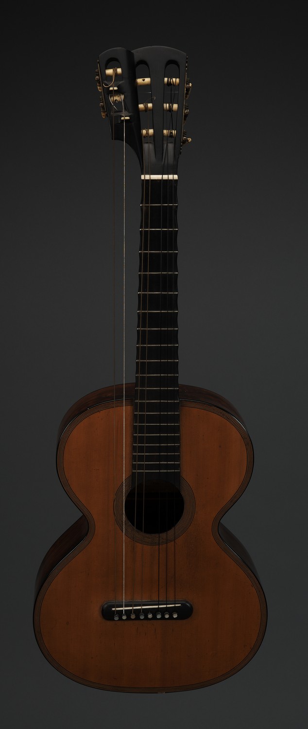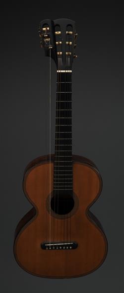 wear overall particularly to back and sides. some delamination to veneer . inset to one bridge pin missing. significant crack to fingerboard & soundhole. cracks to veneer in places.