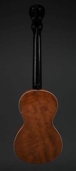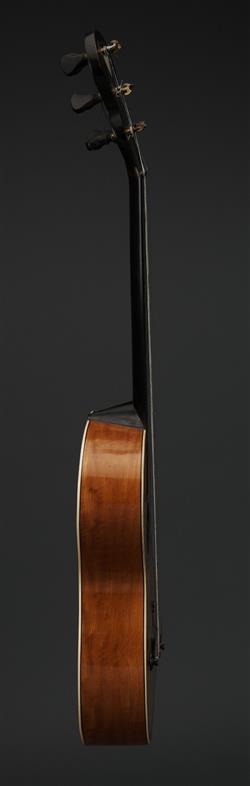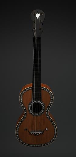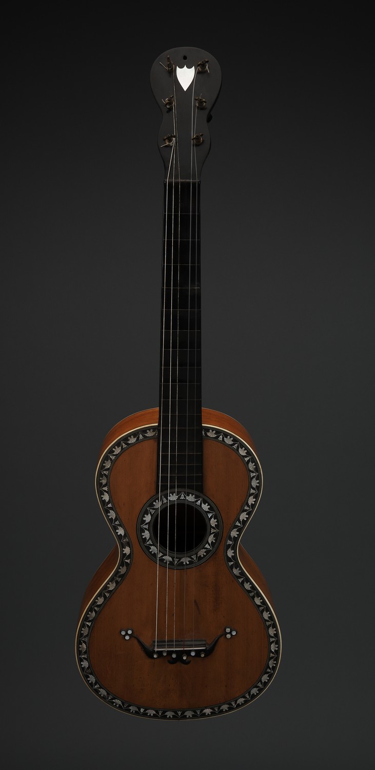 Nicely inlaid with mother-of-pearl to table edges and around sound hole in repeating floriate motifs, 'Beau' imprinted to interior