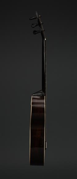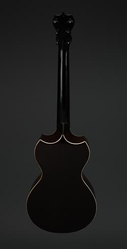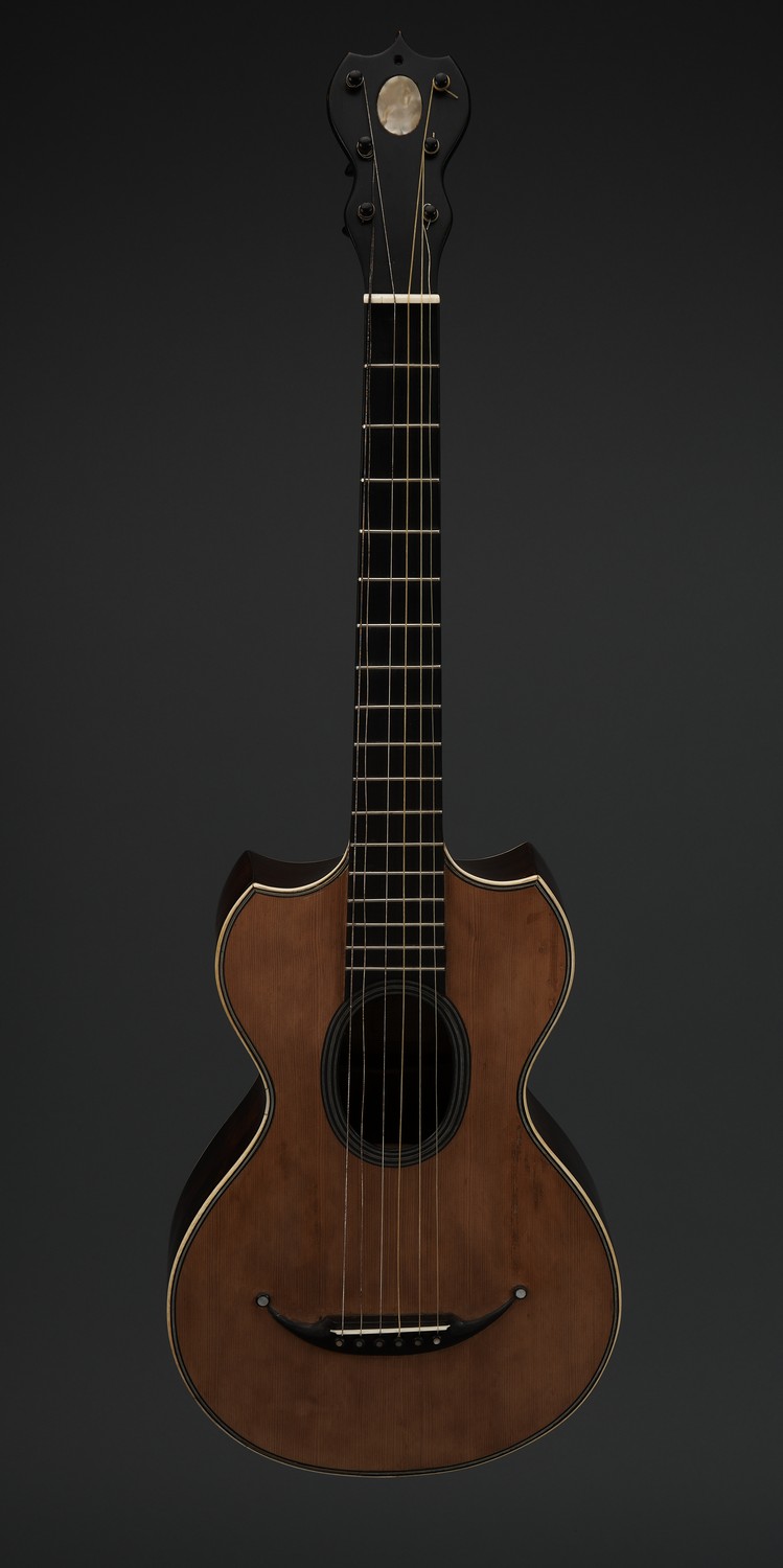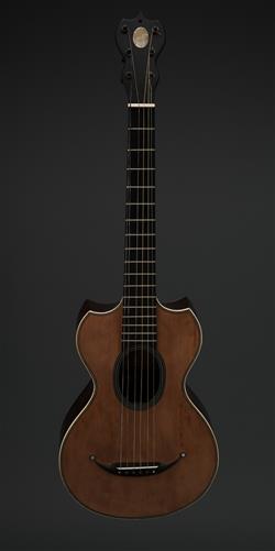 The interestingly shaped guitar, with fine string inlay to edges and around the oval sound hole. Ivory trim. label to interior. Housed in case, not original. Contains Brazilian rosewood.