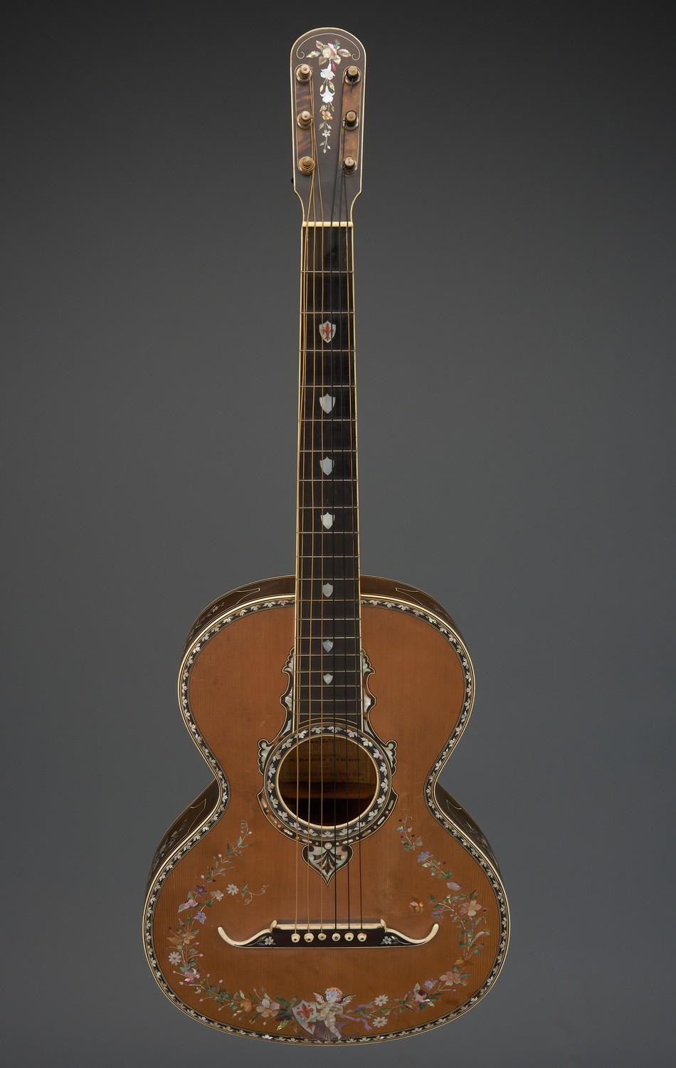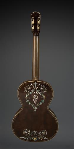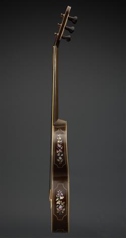 The whole romantically decorated with mother-of-pearl and abalone shell inlay. The lower body boasting a scene of a cherub holding an armourial crest surrounded by floral garlands. The ribs and back richly inlaid with scrolling floriate garlands. Paper label to interior. Brazilian Rosewood with ivory trim.