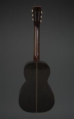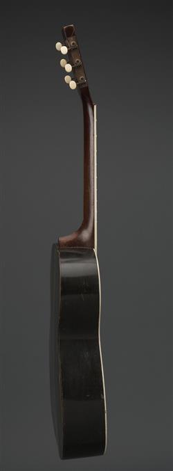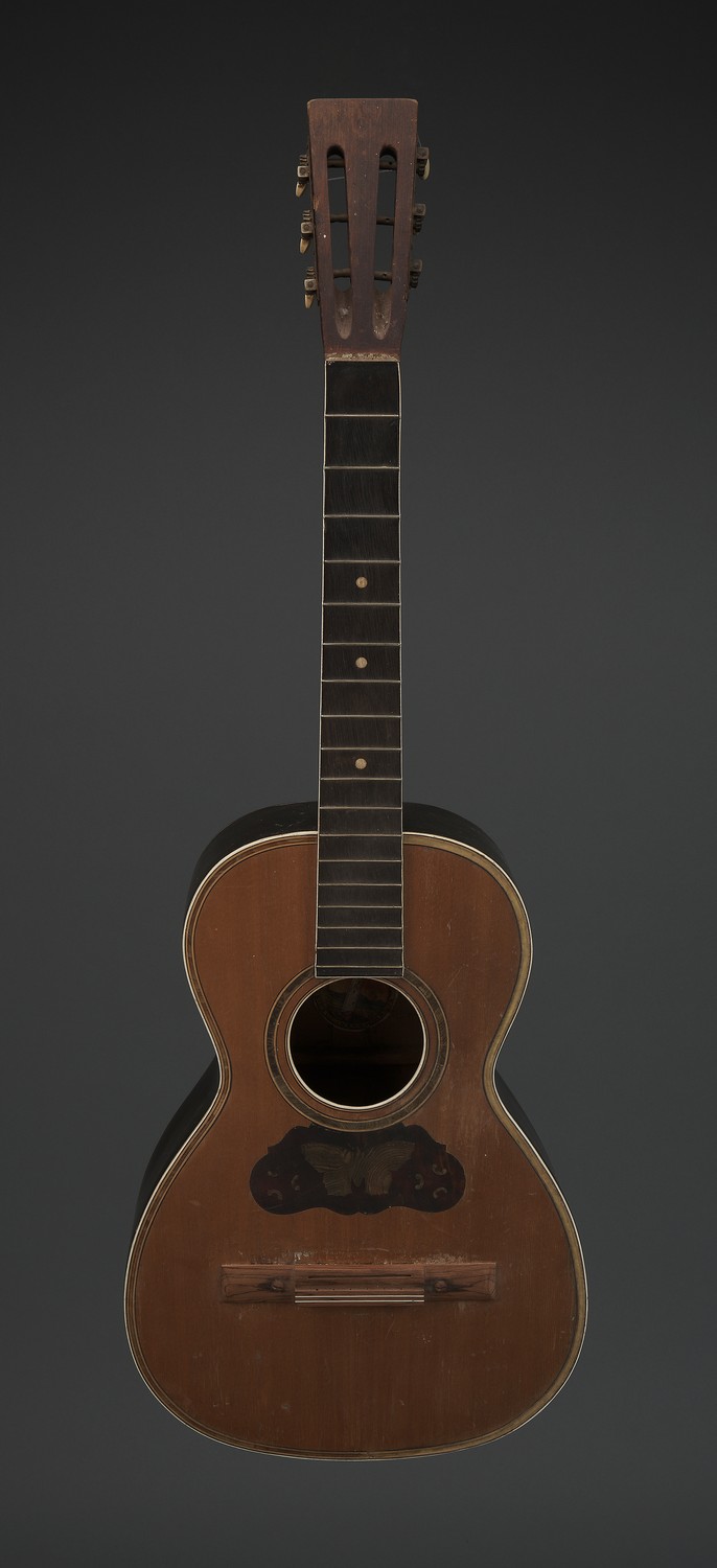 Decorated with butterfly motif beneath sound hole. The verso of guitar decorated with string inlay, paper label to interior