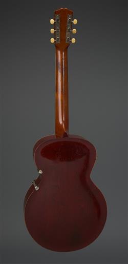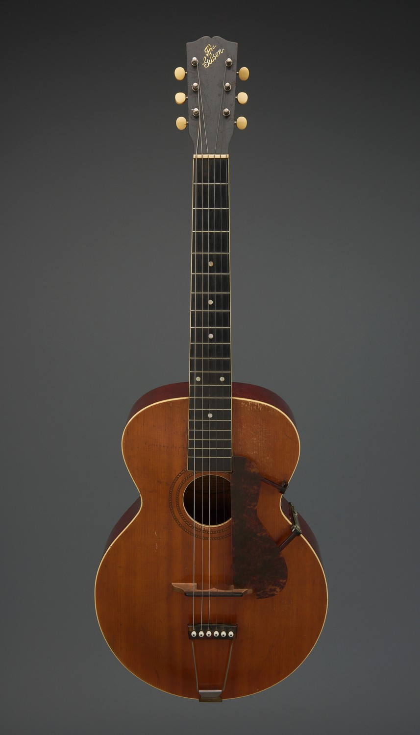 'The Gibson' logo inlaid in mother-of-pearl to headstock, patent stamps to tailpiece, pick guard mount, and pick guard, and paper label to interior. Ivory trim and tuning pegs. Housed in a case