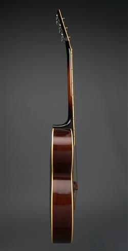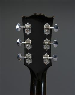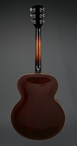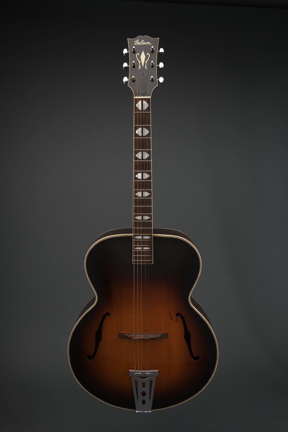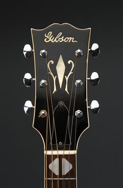 The Gibson logo inlaid in mother-of-pearl to the headstock and to the finger board, inlay to the edges with a pierced metal tailpiece, and paper label to interior. Brazilian rosewood fingerboard and bridge.