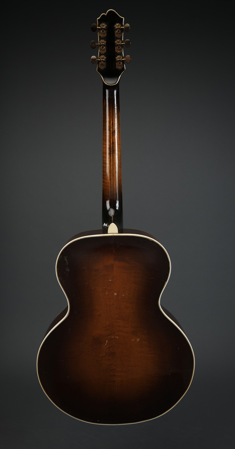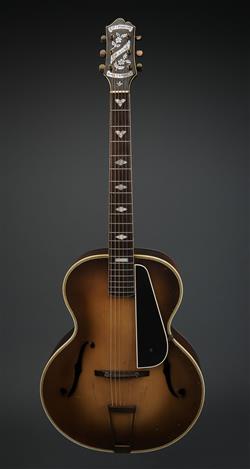 The headstock inlaid with mother-of-pearl cartouches bearing, 'Epiphone/ De Luxe / Masterbilt. Paper label to interior with serial number and marked 1873. Housed in hard case.