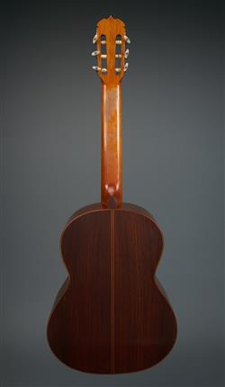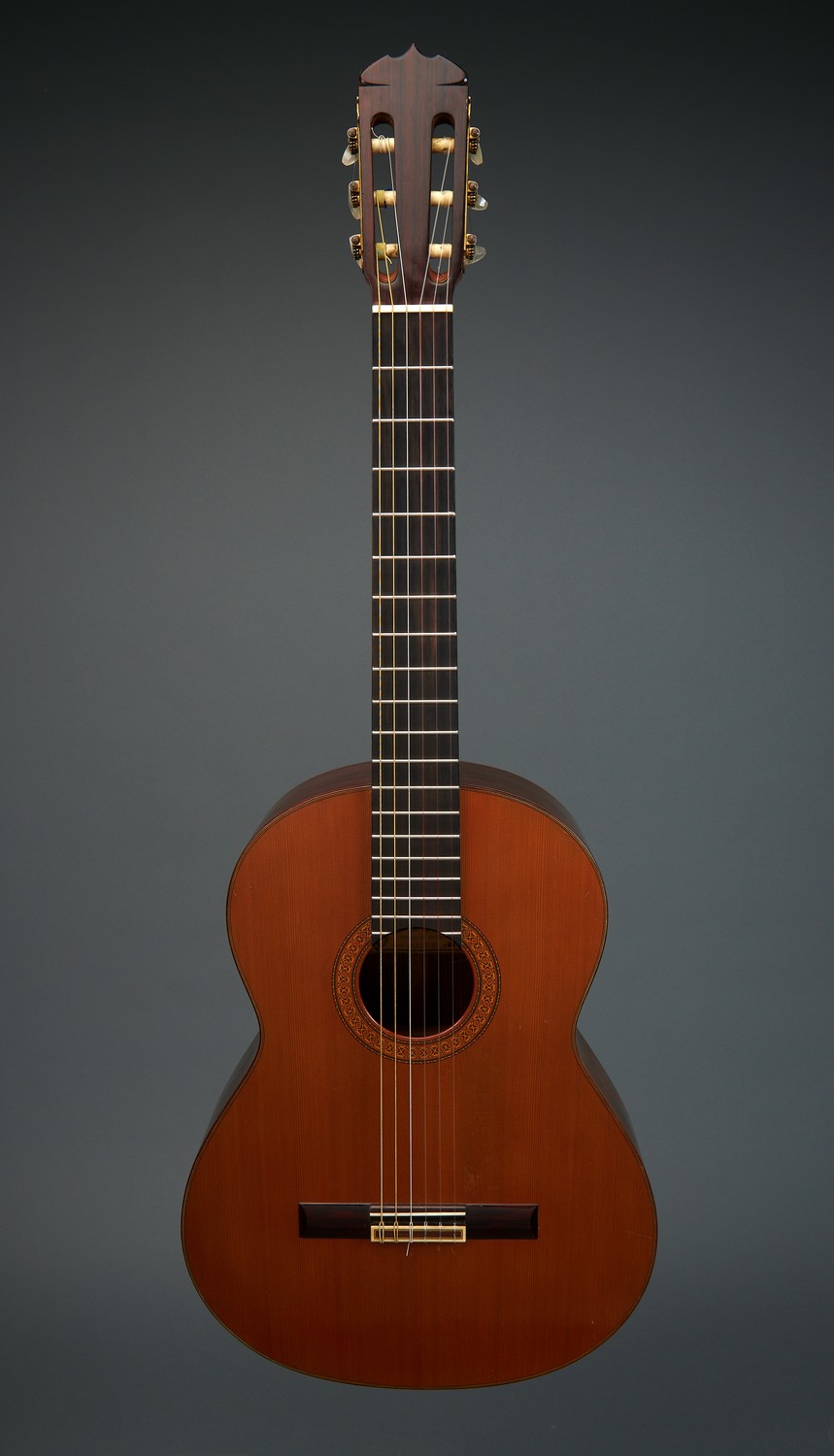 Decorative tunbridge border around sound hole. Brazilian Rosewood. Paper label to interior. With original case.