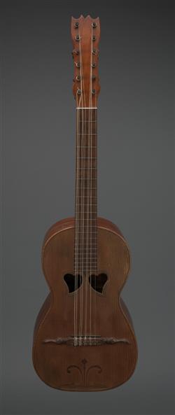 With two heart shaped sound holes, above a double bird ended bridge and a fleur-de-lis motif to lower body, paper label to interior
