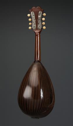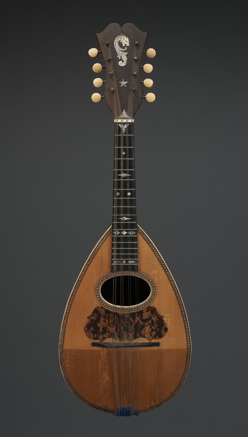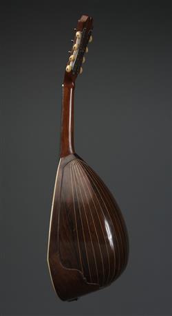 Mother-of pearl-inlay to fingerboard, with decorative motifs to headstock, intricate marquetry to the edges and around the sound hole, and string inlay to the bowl-back. With a tortoiseshell pick guard, and ivory tuners. Contains Brazilian rosewood.