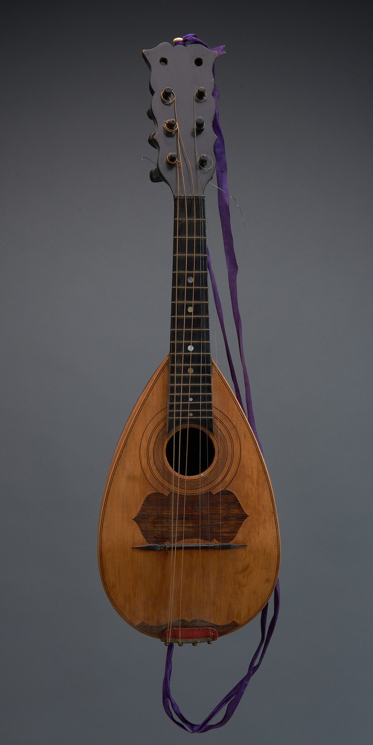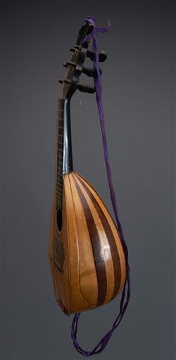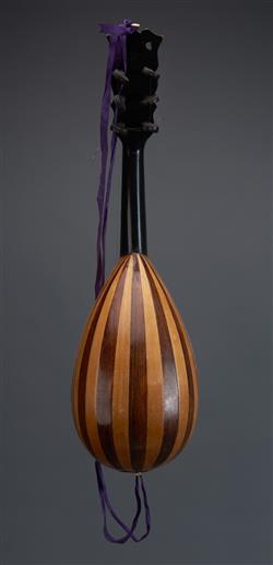 The typical bowl-back stylistically crafted in alternating panels of wood. Fine parquetry inlay around sound hole, with an ebonised fingerboard and headstock. Contains Brazilian rosewood.