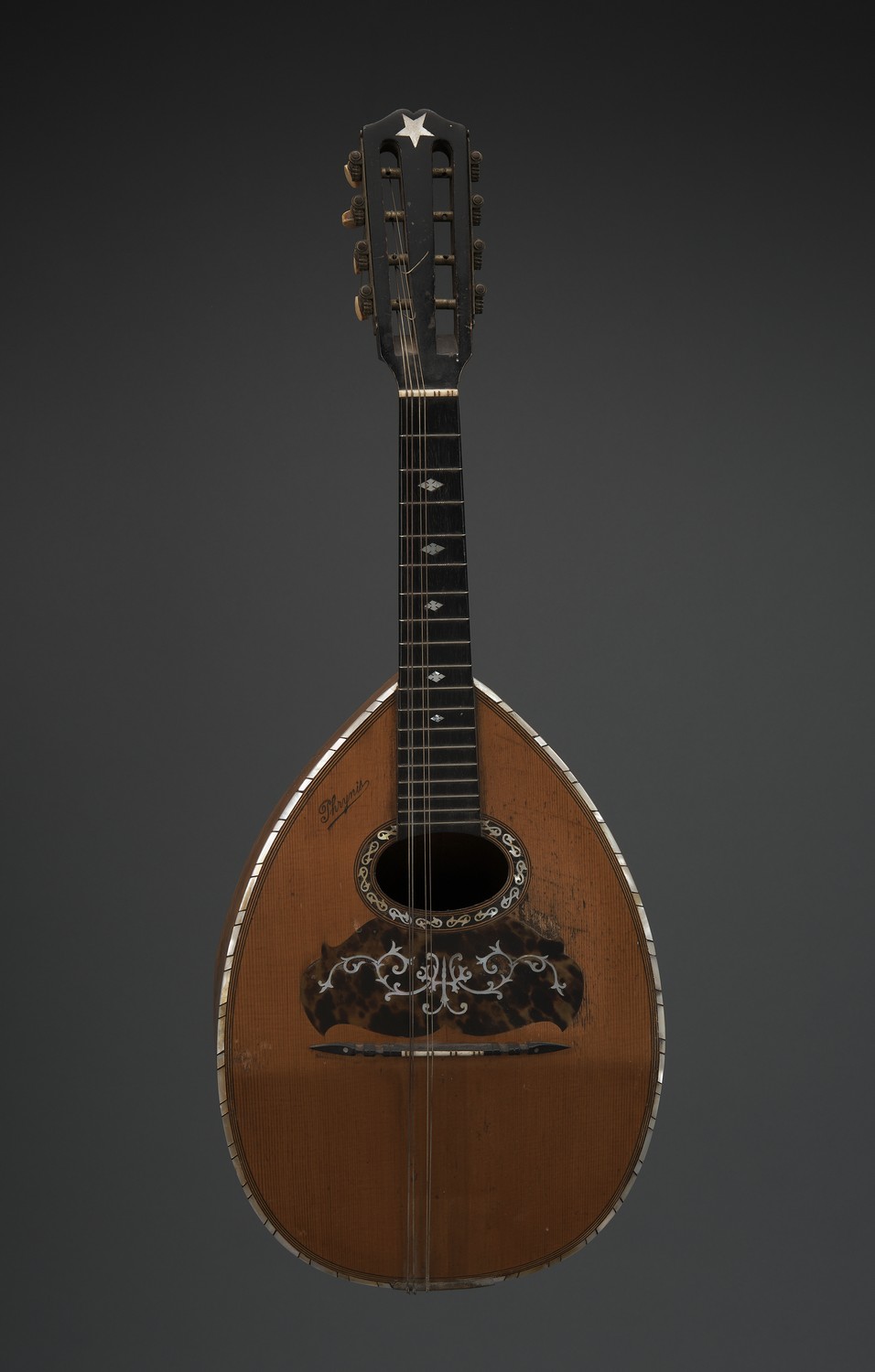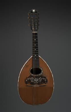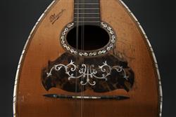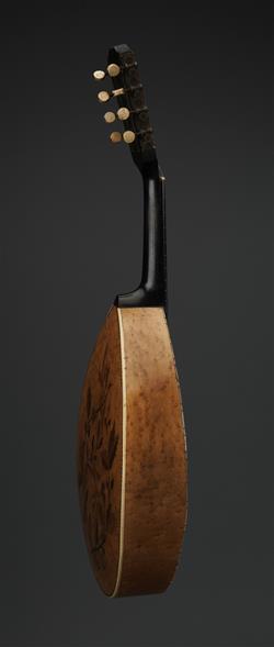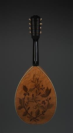 Flat back design, with mother-of-pearl inlay to front edges, around sound hole and to tortoiseshell pick guard. Fine parquetry design to verso. Signed Phrynis to front. Contains Brazilian rosewood.