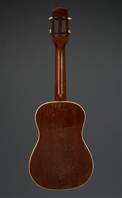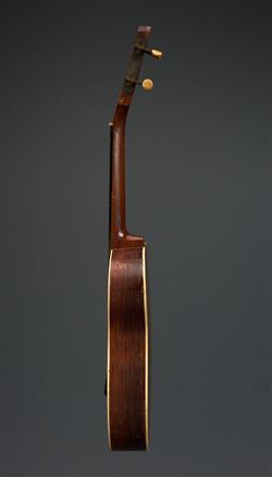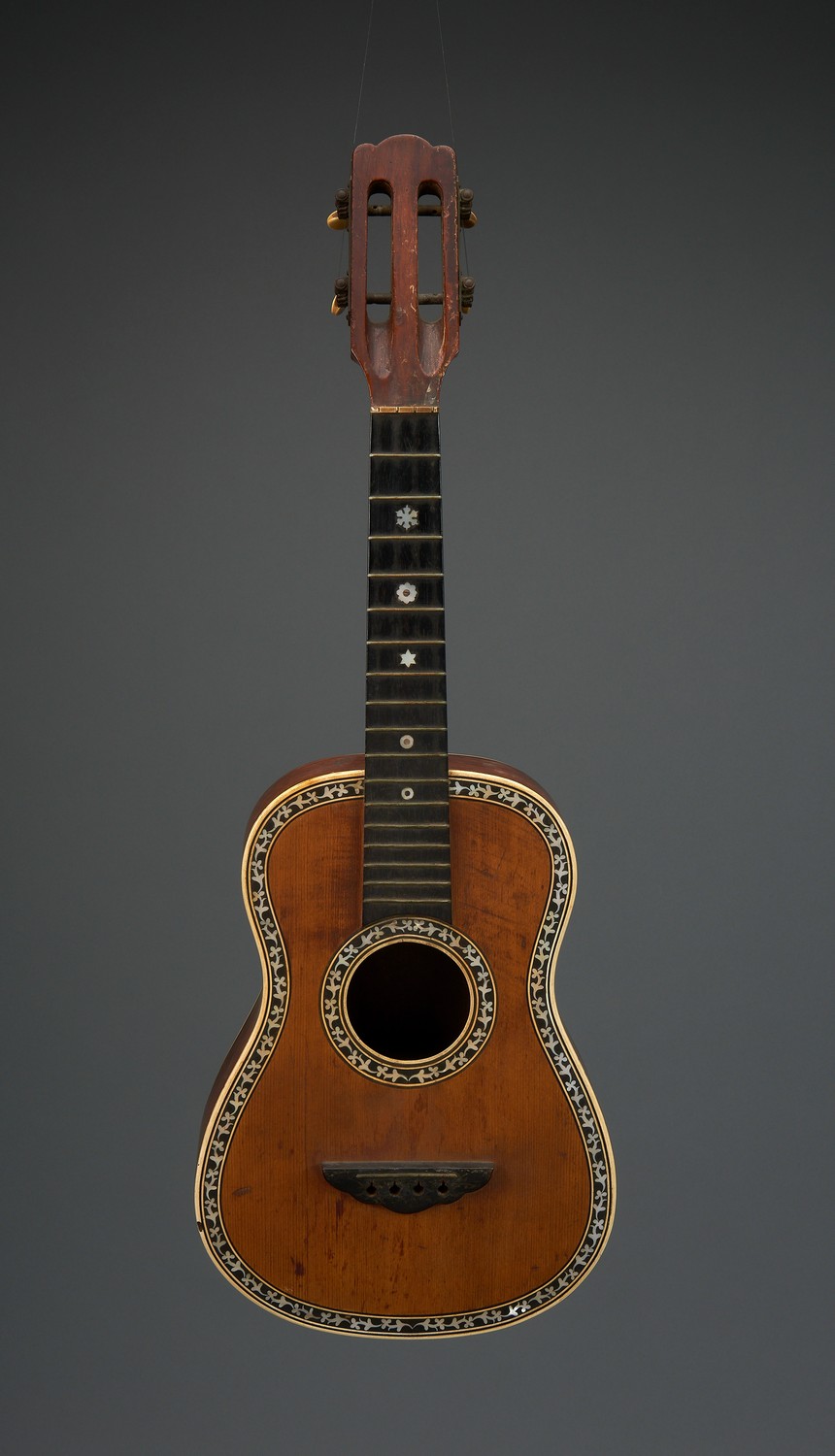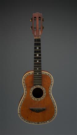 Mother-of-pearl inlay to the finger board, and a repeated foliate inlay encircling the sound hole and edges. Contains brazilian rosewood.