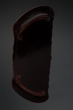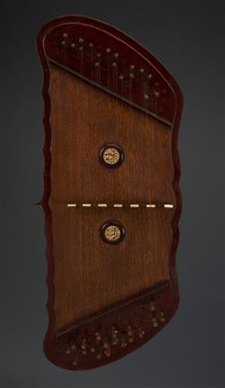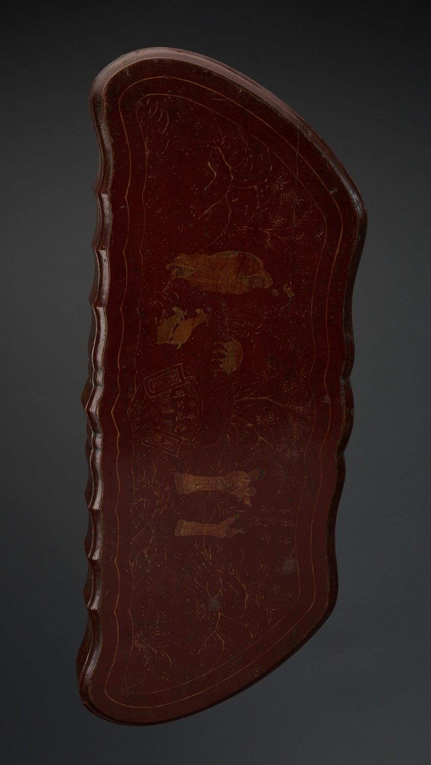 In two tone lacquer with a farming scene to one side, the two sound holes inset with carved, pierced roundels