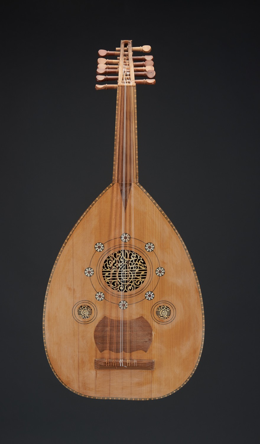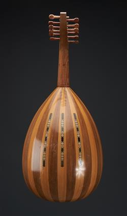 Of typical form, with three bands of inlay to the back of the body. Paper label to interior.