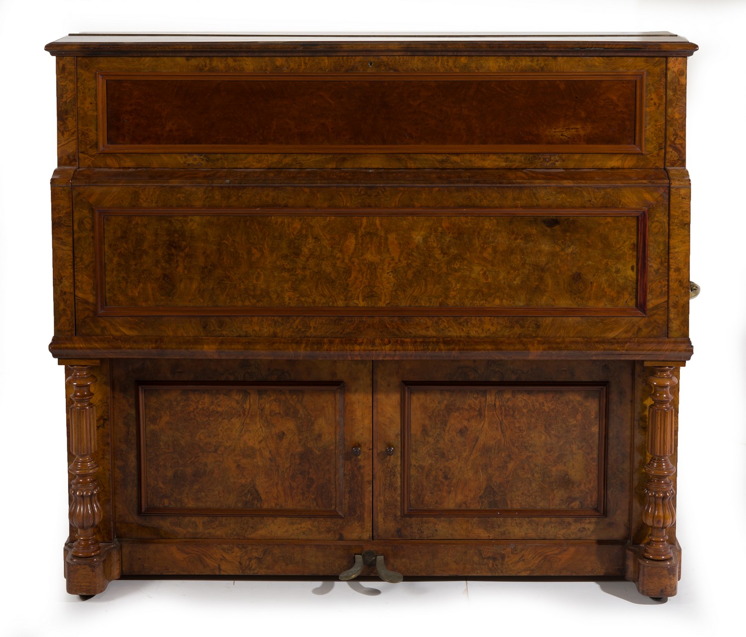 In burl walnut, with folding keyboard, comprising seven octaves, the key board supported by two carved columns, above the keyboard inscribed in cut brass 'Aucher Brothers/ Prize Medals/ Manufactured expressly for/ Paling & Comp. (PLEASE NOTE THIS ITEM MUST BE REMOVED BY CLIENTS OR CARRIERS AT THE CUSTOMERS EXPENSE.)