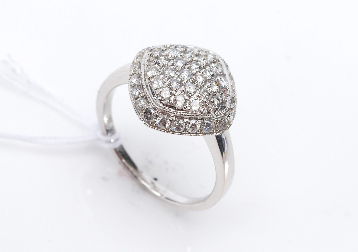 A DIAMOND CLUSTER RING IN 18CT WHITE GOLD, DIAMONDS TOTALLING APPROXIMATELY 0.83CTS, SIZE M, 4GMS