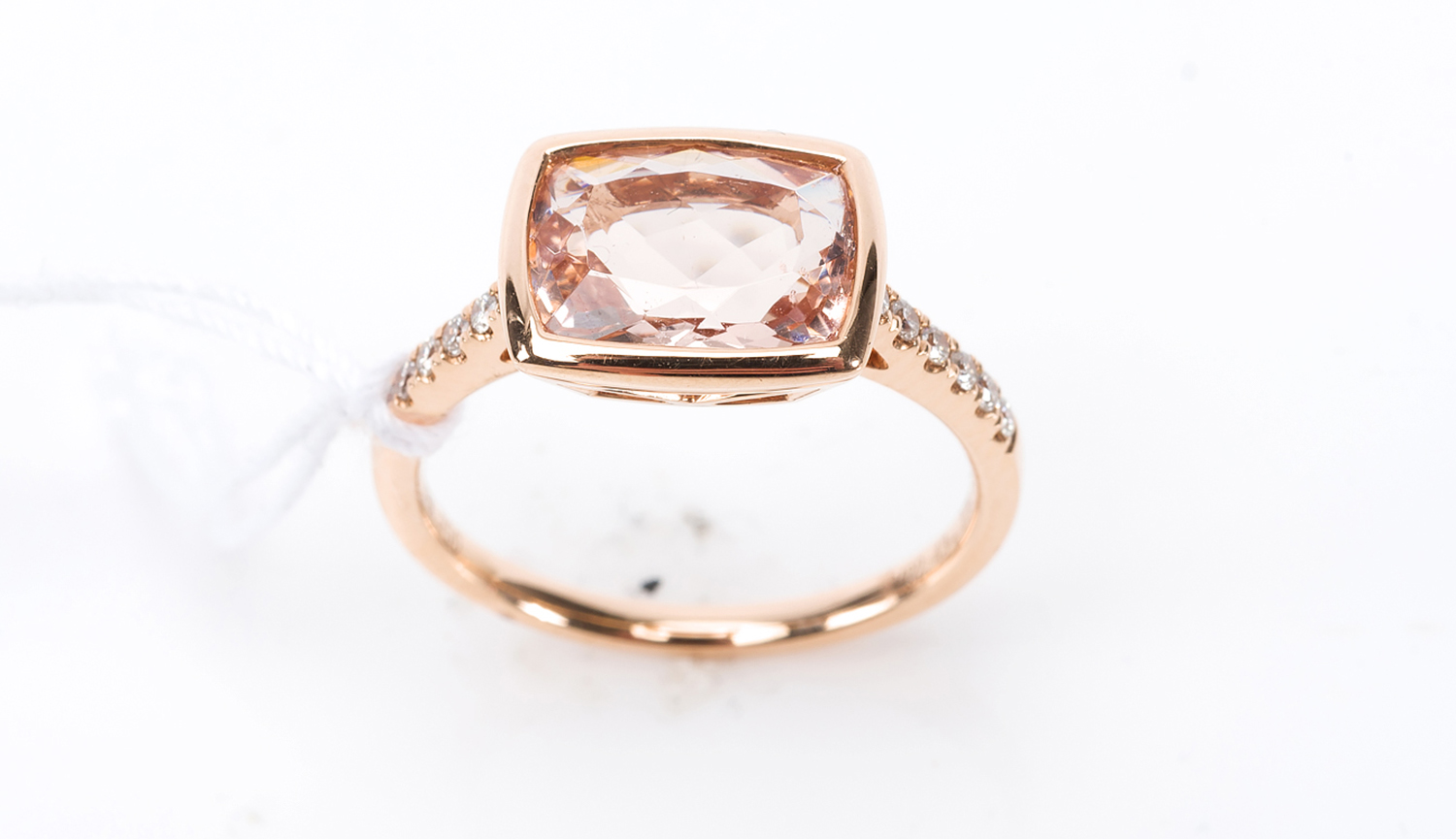 A MORGANITE AND DIAMOND RING IN 18CT ROSE GOLD, MORGANITE OF 2.43CTS, APPROXIMATE TOTAL DIAMOND WEIGHT 0.125CTS, SIZE M, 3.4GMS