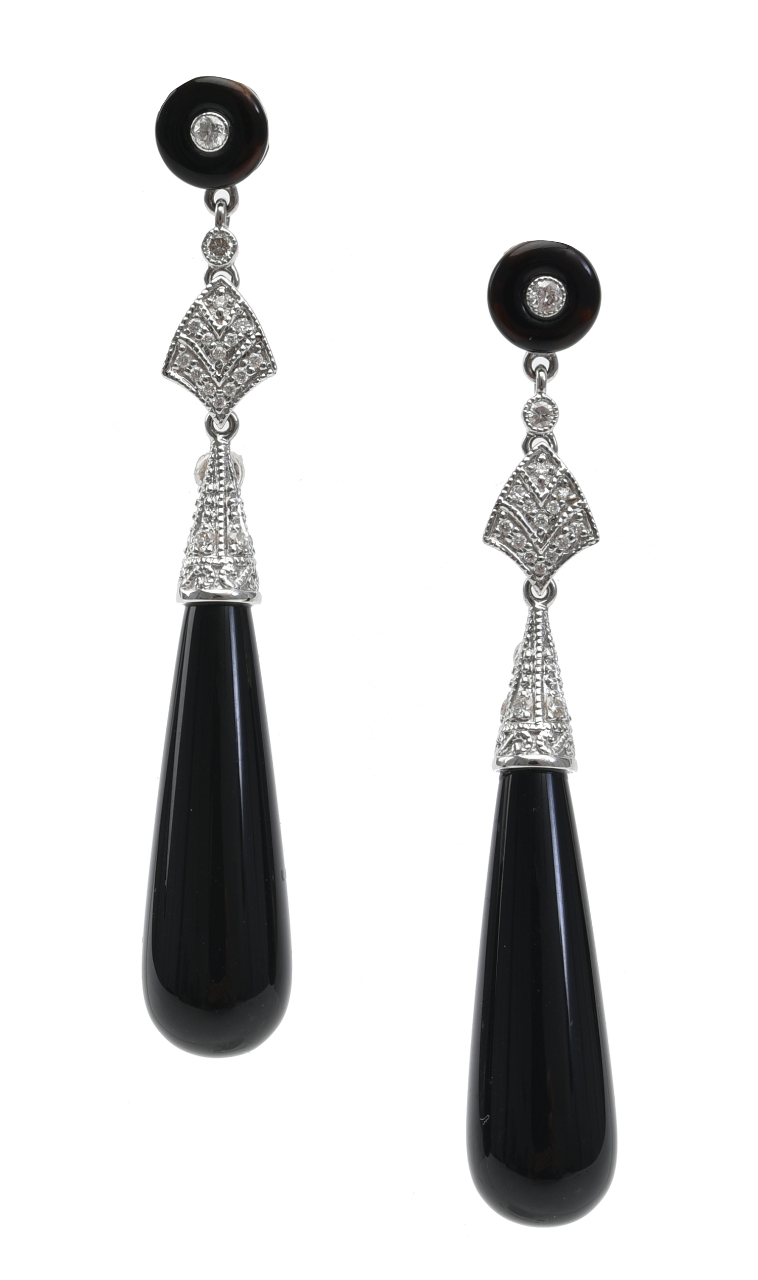 Of Art Deco style, each earring comprising a tapering onyx drop on a diamond set cap and surmount, to an onyx and diamond set stud fitting, in 18ct white gold.