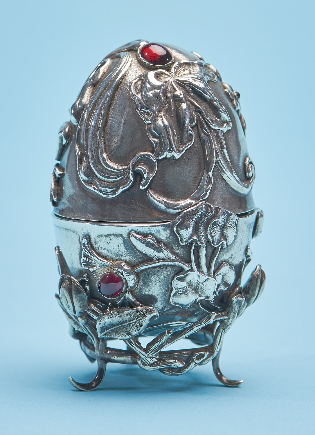 Of ovoid form, with embossed naturalistic motifs, and inset with garnet cabochons. Raised on a pierced floral decorated three-footed stand. With a Russian silver 88 Zolotnik mark.
