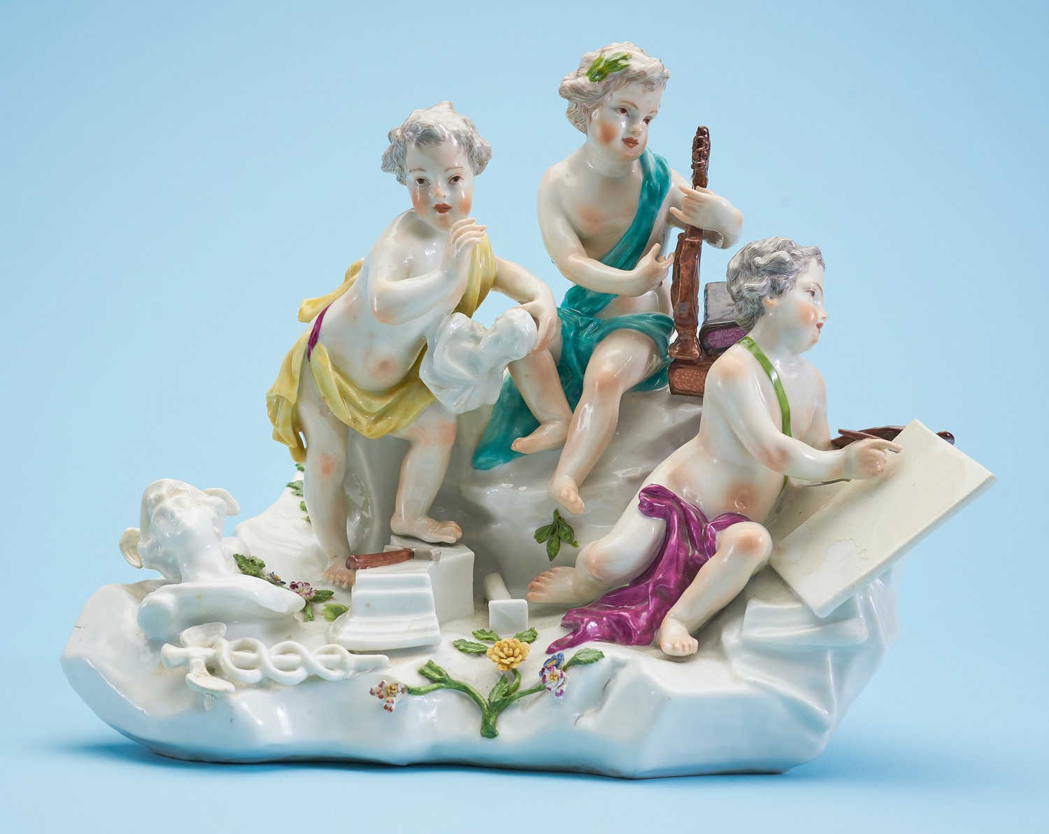 Modeled with three brightly draped putti surrounded by objects representing the arts. Underglaze mark to base