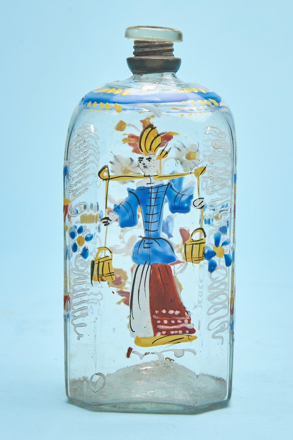 Rectangular in form with chamfered sides, decorated with enamelled figures in traditional costume.