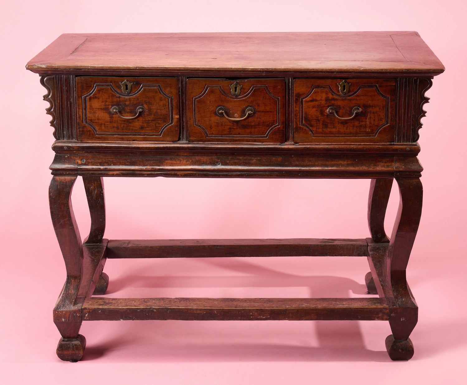 The rectangular top above three drawers with brass escutcheons and handles, raised on four serpentine legs united with stretchers