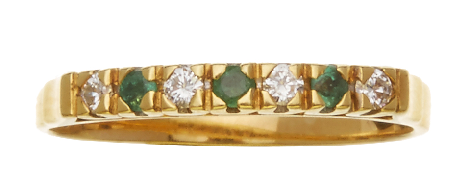 Set with three emeralds, estimated total weight 0.10cts and four diamonds, estimated total weight 0.16 carats, set in 18ct gold, ring size O 1/2.