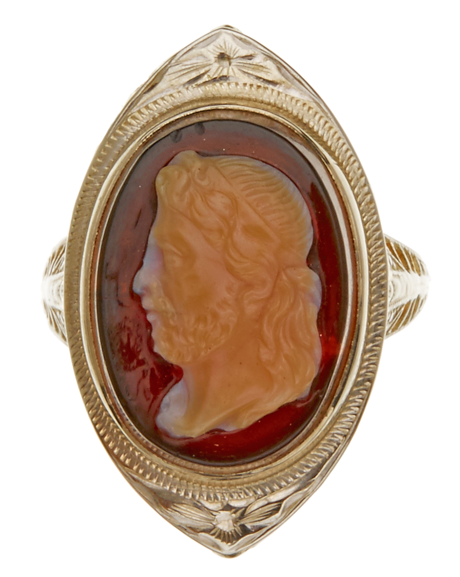 The oval hardstone cameo, depicting a man in profile, within a decorative carved surround, in 9ct gold, ring size L 1/2.